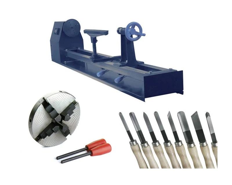 Begyndersæt med både trædrejebænk, firklo og drejejern. Består af 1000 mm drejebænk, en firklo med samtidig tilspænding af alle bakker og et sæt med 8 drejejern.