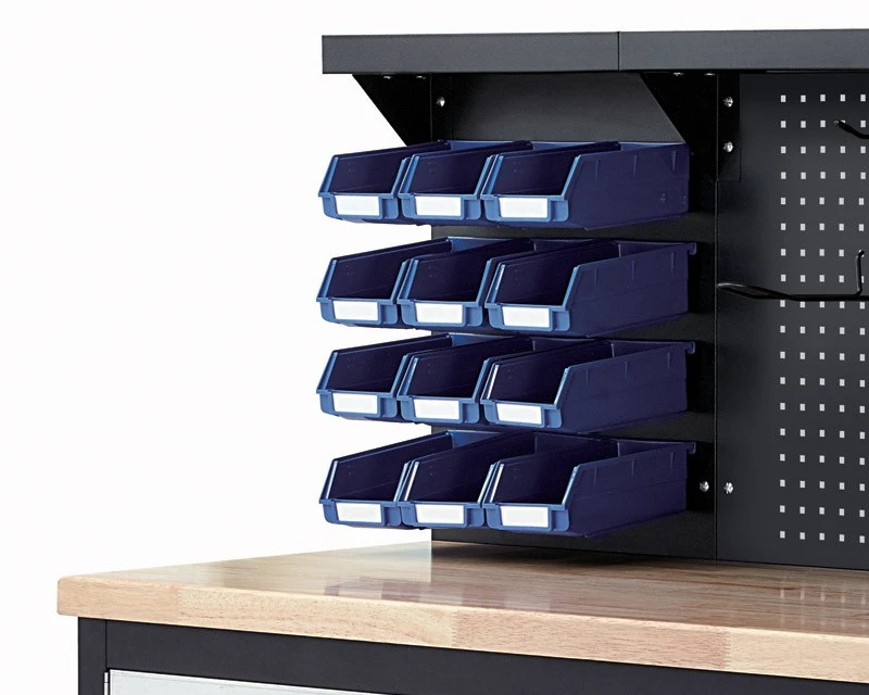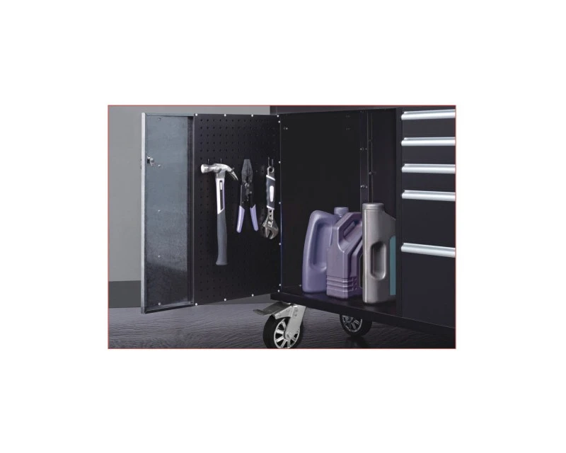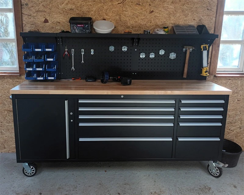 Kombineret værkstedsvogn og arbejdsbord i en lang udgave med en bordplade på hele 215 x 50 cm og hulplade bagvæg. En virkelig kraftig løsning med 38 mm bordplade og også 12 løse kasser til ophæng på hulpladen. Desuden er det i alt 10 skuffer i forskellige størrelser og 1 stort skab og en håndtag til at flytte vognen rundt. Bemærk også de kraftige hjul, hvor de 2 forreste er med bremse.