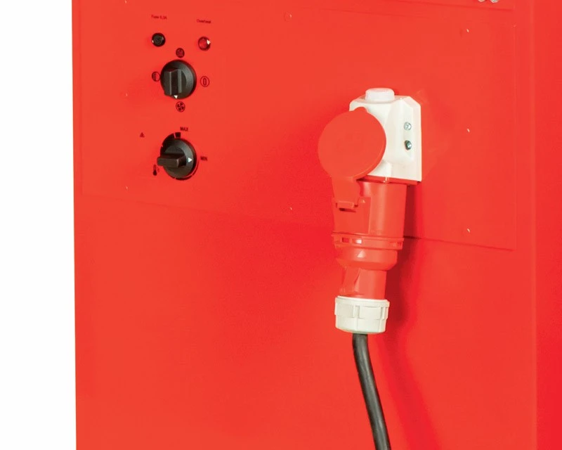 Varmekanonen har termostat og 2 indstillinger for varme (9 kW eller 18 kW). Desuden er denne model meget støjsvag og forsynet 4 hjul og håndtag, så den også er nem at flytte. Kræver 400 volt og minimum 26 ampere sikring.